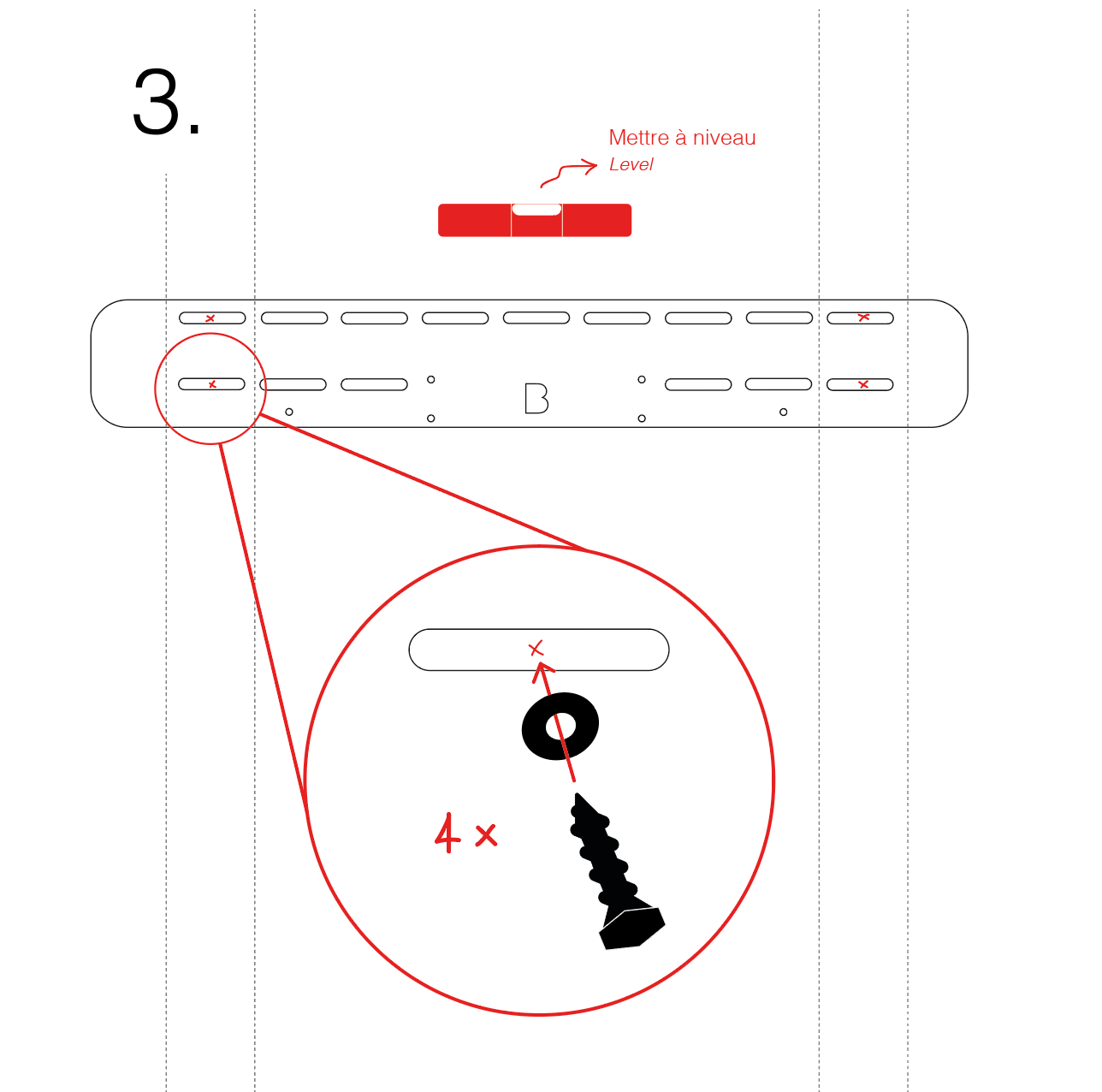 3. Marquer au crayon l’emplacement des 4 vis de soutien. Celles-ci doivent être directement au centre des montants.